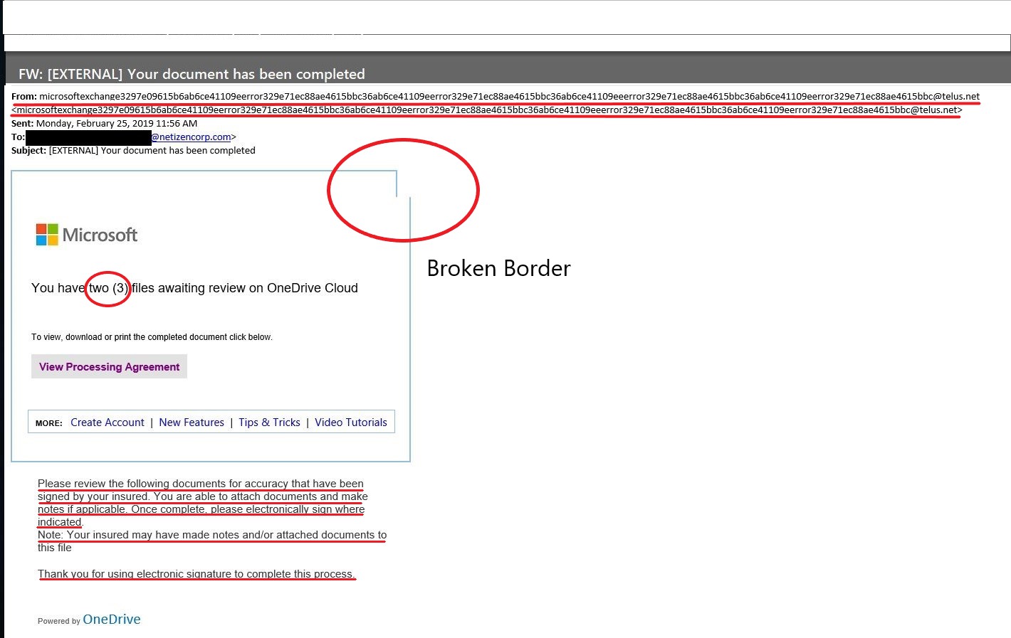 This week, we are featuring another phishing email that was received in our office. What you see (below) is an attempt by a hacker to collect log-in information from anyone falling for the phish. The perpetrator sent this email to a company-wide distribution list with the hopes of obtaining log-in information from an executive-level employee. Although it might seem tailored to target a specific company or organization, this week’s phish is typical in that it offers something to the recipient that would be a normal function in almost any business. In the body, the email states the purpose of the message is that it is being sent for “your” review and signature. This indicates that the target is a “decision maker” that would presumably have access to a business’ sensitive information. The bait is often a call to act on something by clicking or following a link to a fake log-in page, in this case, “3 files” awaiting “your” review. OneDrive and SharePoint are frequent vehicles for these attacks, because of the number of users of these Microsoft products. An example email follows below: