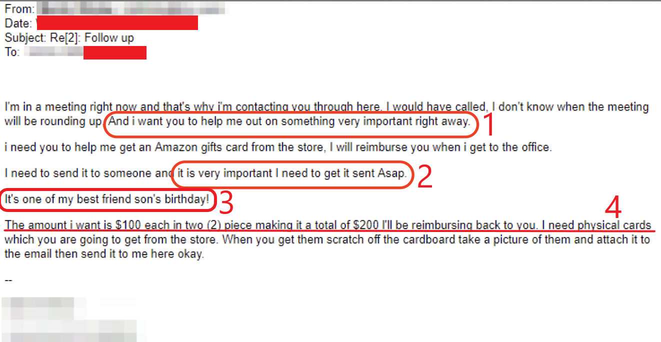 Phishing attempts are often carried out with urgent messages that are meant to provoke the victim to act without rationally thinking about the contents of the email. In this instance, an employee received an email message from their boss asking them to buy Amazon gift cards for his best friend’s son’s birthday.