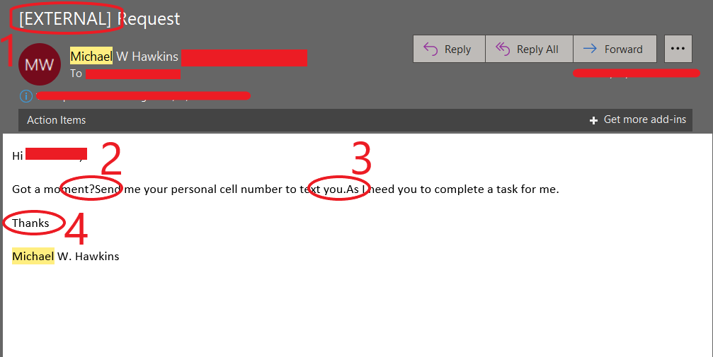 As is typical for most businesses, our HQ Office inbox receives the occasional phishing email attempting to trick an employee into sending the perpetrator some sort of payment or money order. In this case, the perpetrator was impersonating CyberSecure Solutions CEO, Michael W. Hawkins. Fortunately, Netizen and CyberSecure Solutions staff are regularly trained in email phishing and social engineering awareness. The attempt pictured below can be deconstructed and analyzed to point out the obvious, and not so obvious, details that prove this email to be fraudulent.