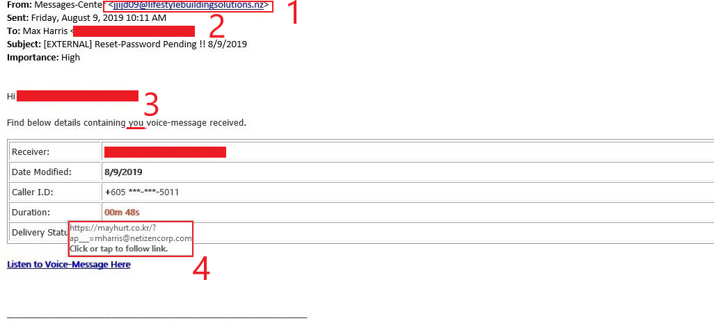 Phishing attempts are often carried out with the purpose of tricking the target into downloading or accidentally running a malicious script on their devices. This example of a phishing attempt that was received in our office poses as a voice-message with a high importance tag. The urgent message, coupled with obscure details, can appeal to the victim’s curiosity and cause them to click on the infected link.