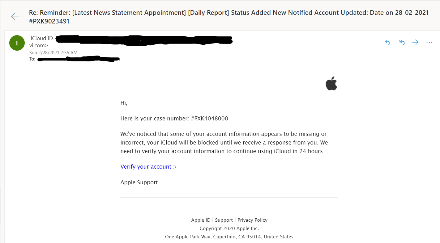 - The first red flag on this email is the sender address. Big corporations like Apple will never email you outside of their company emails. In the future, check all suspicious emails from companies against previous ones you’ve received and make sure the sender address is the same.