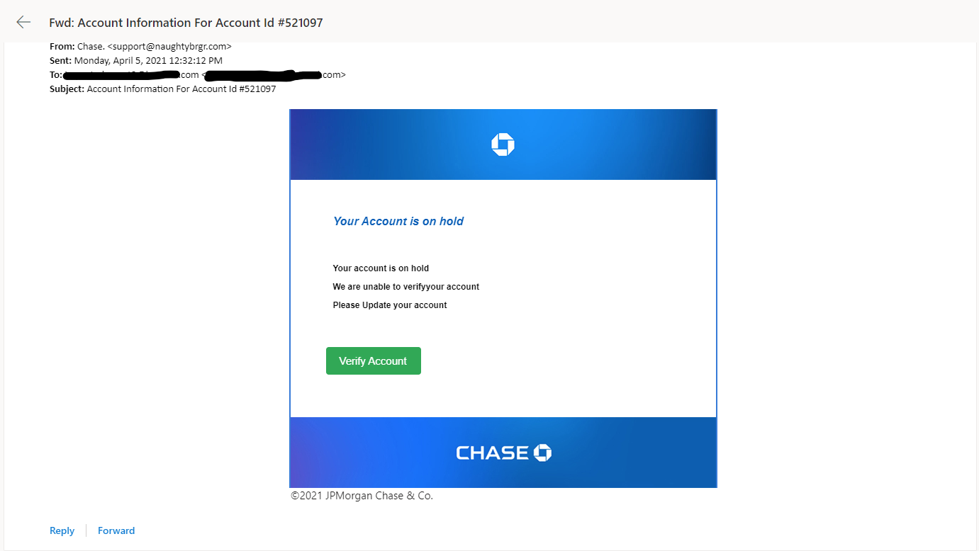 - The first red flag on this email is the sender address. Big corporations like JPMorgan Chase will never email you outside of their company emails. In the future, check all suspicious emails from companies against previous correspondences you’ve received and make sure the sender address is the same.