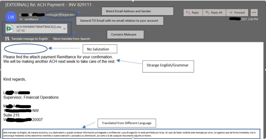 - The final warning sign for this email is the messaging inside the email. In this instance, this email was translated from another language prior to this screen grab. If an email is coming from an unknown sender, in a different language, then there is always room for concern.