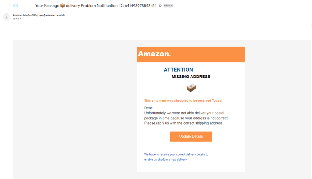 - The final warning sign for this email is the callouts at the bottom. This message says to “update detals”. Brief messaging is normally used in scams like this to attract people to just read what they say and click as fast as possible. One easy way to spot a scam email is to reference previous emails you’ve received from the company. When compared to other correspondences from Amazon, this email immediately looks different.