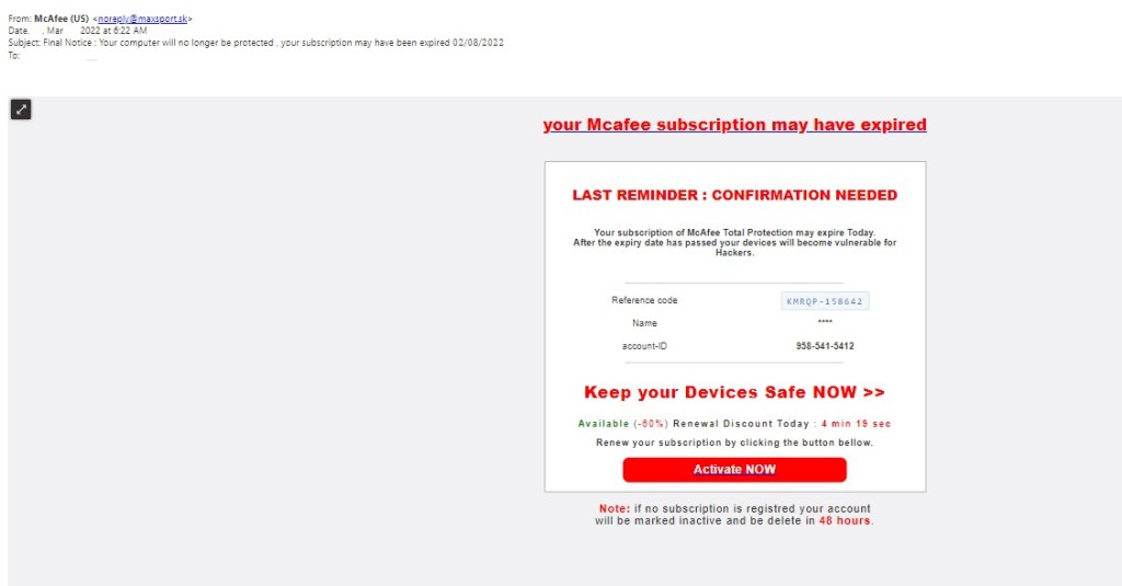 Phishing attempts can often target specific groups that can be exploited by malicious actors. In this instance, we see a phishing scam targeting unsuspecting McAfee customers. This email appears to be a notification alerting us that our computer is no longer protected and our subscription has expired. We are then prompted to renew our subscription and activate the code below now. This email contains a convincing message saying to protect my device from hackers, so why not click the link and update details? Unfortunately, there are plenty of reasons not to click that email right away.