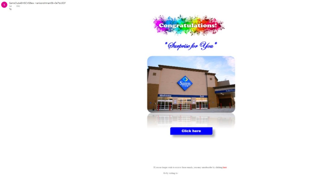 Phishing attempts can often target specific groups that can be exploited by malicious actors. In this instance, we see a phishing scam targeting unsuspecting Sam’s Club customers. This email appears to be a notification alerting us that there is a surprise waiting for us. We are then prompted to “click here” to see what the surprise is. This email contains a catching congratulations message and a photo of Sam’s Club, so why not click here? Unfortunately, there are plenty of reasons not to click that email right away.