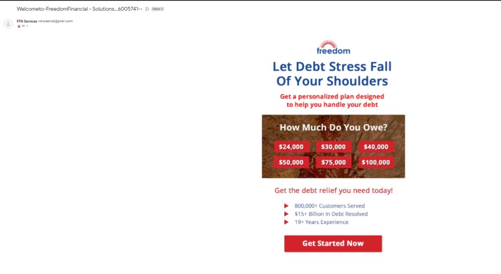 Phishing attempts can often target specific groups that can be exploited by malicious actors. In this instance, we see a phishing scam targeting unsuspecting debt holders. This email appears to be a notification alerting us that Freedom Financial can help us with large amounts of debt relief. We are then prompted to “get started now” to get our debt relief today. This email contains a note about getting personalized debt help and that we can get the relief we need today, so why not click here? Unfortunately, there are plenty of reasons not to click that email right away.