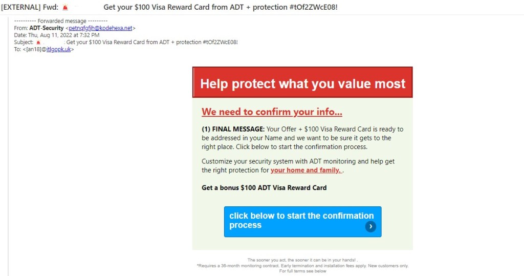 - The final warning sign for this email is the $100 bonus ADT Visa Reward Cart. Threat actors use monetary incentives to entice unsuspecting consumers with phishing tricks. Always be on the lookout for offers that look too good to be true.