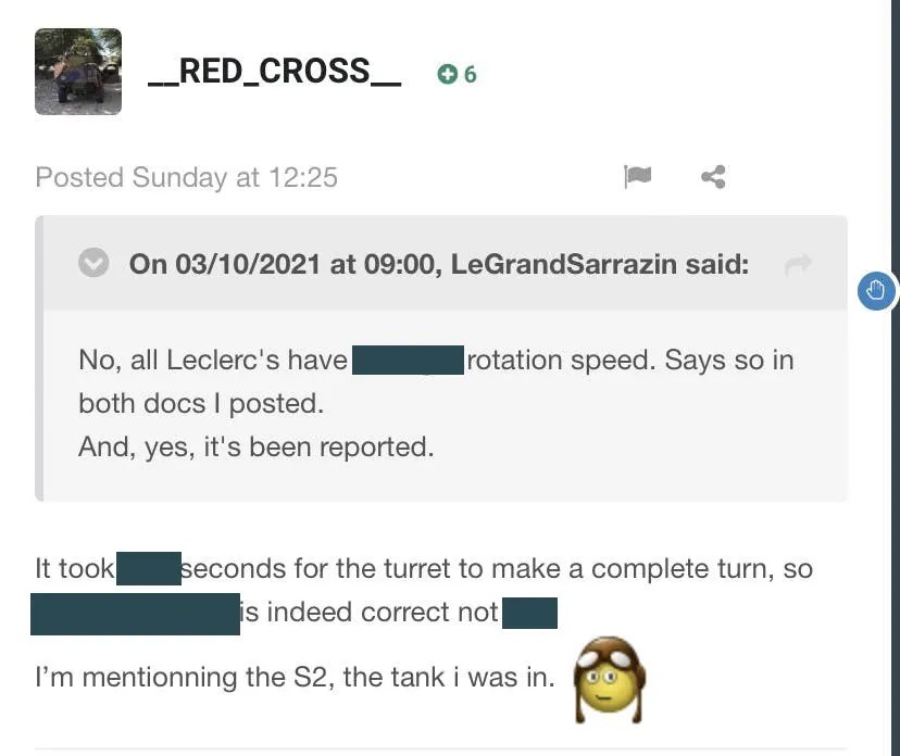 In October 2021, documents about the French Leclerc tank were posted on the forum to resolve an argument about turret rotation speed. The poster claimed to be a crew member on the Leclerc S2, which was fielded by the French Army at that time. The post was removed within a few hours due to Gaijin’s strict moderation policies.
